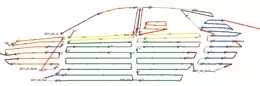 為實(shí)現(xiàn)面漆B2一遍成膜的整車噴涂驗(yàn)證,經(jīng)過對(duì)機(jī)器人仿形軌跡進(jìn)行了系統(tǒng)優(yōu)化調(diào)整,重點(diǎn)關(guān)注邊角等區(qū)域,經(jīng)調(diào)整后的機(jī)器人仿形(以瑞風(fēng)S5為例)如下圖2所示: